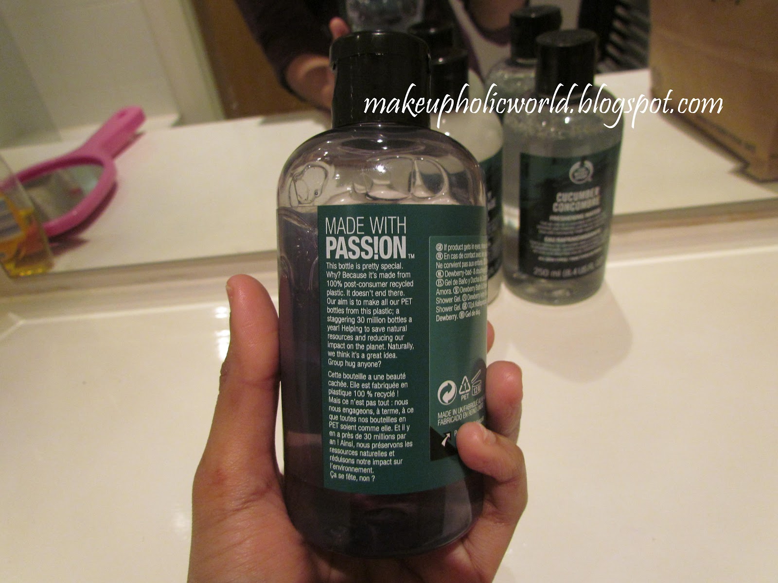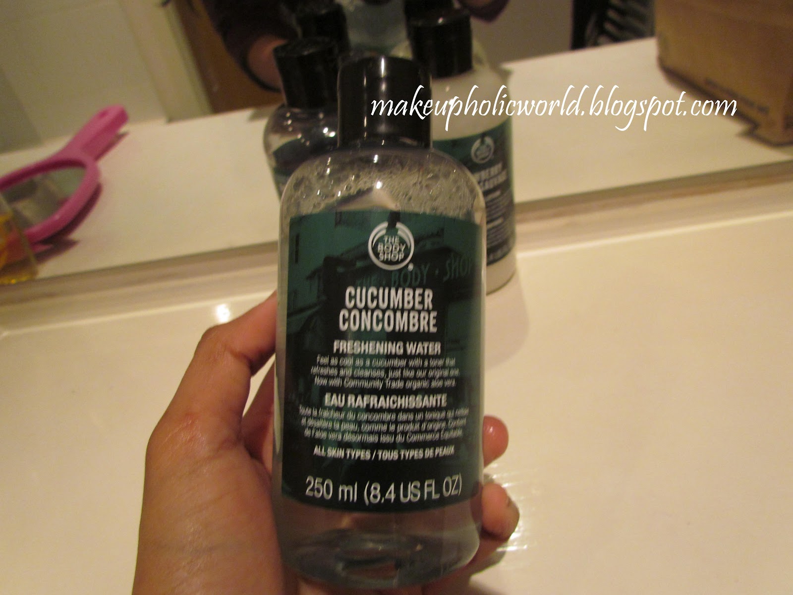 This cucumber water has a cucumber fragrance and it is good..Sometimes I dab it all around my face to remove dirt…When doing my CTM routine I use this..:)