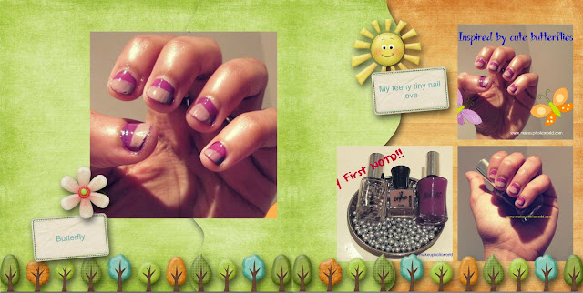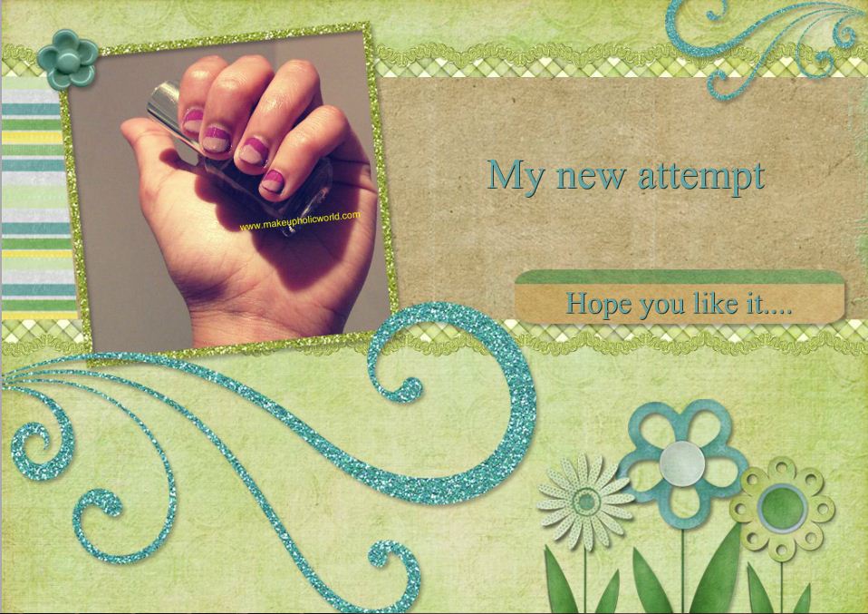 Hi makeupholics….Today I am going to show you my first attempt to do a nail color….I am not a big fan of nail polishes or Nail colors…hehehe:D only because I have teeny tiny nails and I am not an expert in nail art…But, I really wished to do a lovely nail color when I see different NOTDs in many blogs everyday…So, Here’s my very first attempt to do nail design..Also, I tried to frame it in a lovely way…Your comments are most welcome……