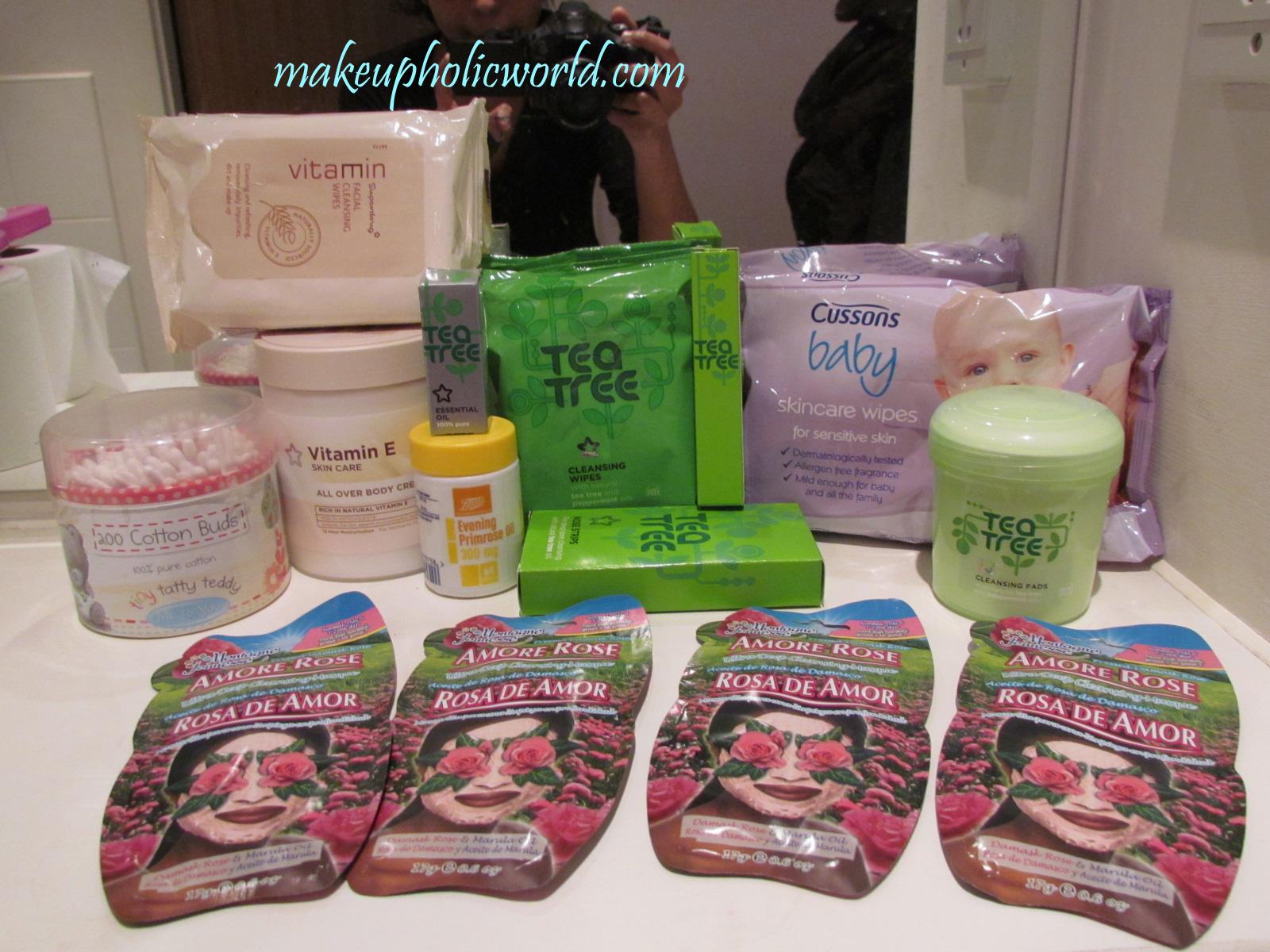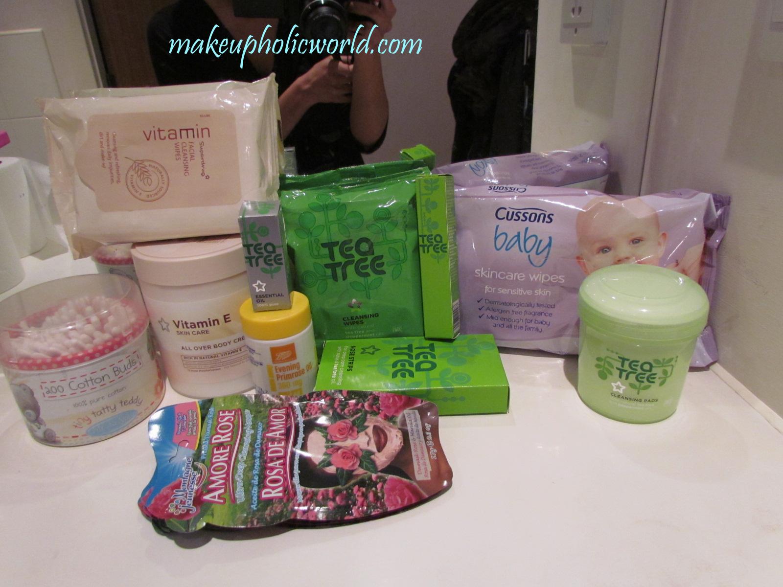 I bought some skin care wipes, a Vit E body cream, tea tree oil, Tea tree spot stick, nose strips, Face masks, cleansing pads, and Evening Primerose oil